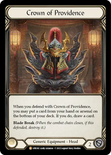 When you defend with Crown of Providence, you may put a card from your hand or arsenal on the bottom of your deck. If you do, draw a card.