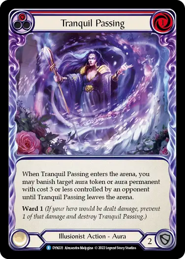 When Tranquil Passing enters the arena, you may banish target aura token or aura permanent with cost 3 or less controlled by an opponent until Tranquil Passing leaves the arena.