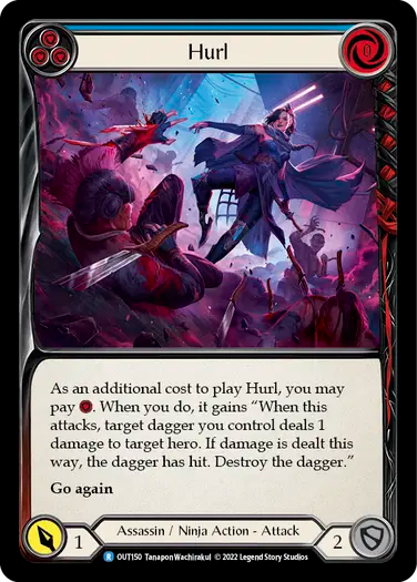 As an additional cost to play Hurl, you may pay [1 Resource]. When you do, it gains "When this attacks, target dagger you control deals 1 damage to target hero. If damage is dealt this way, the dagger has hit. Destroy the dagger."