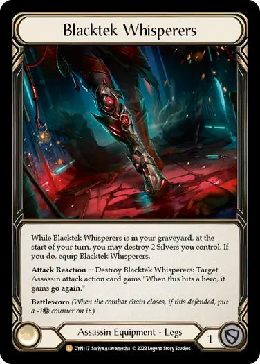 Attack Reaction — Destroy Blacktek Whisperers: Target Assassin attack action card gains "When this hits a hero, it gains go again."