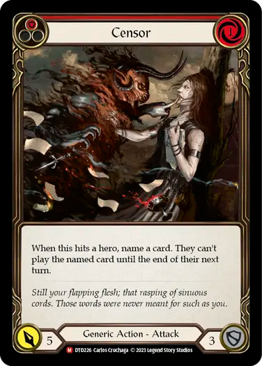 When this hits a hero, name a card. They can't play the named card until the end of their next turn.