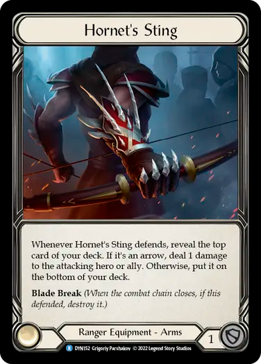 Whenever Hornet's Sting defends, reveal the top card of your deck. If it's an arrow, deal 1 damage to the attacking hero or ally. Otherwise, put it on the bottom of your deck.