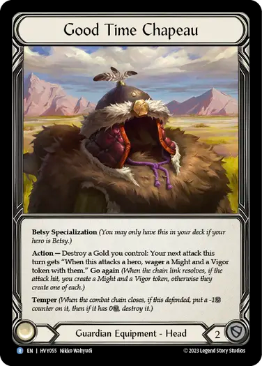 Action -- Destroy a Gold you control: Your next attack this turn gets "When this attacks a hero, wager a Might and a Vigor token with them." Go again (When the chain link resolves, if the attack hit, you create a Might and a Vigor token, otherwise they create one of each.)
