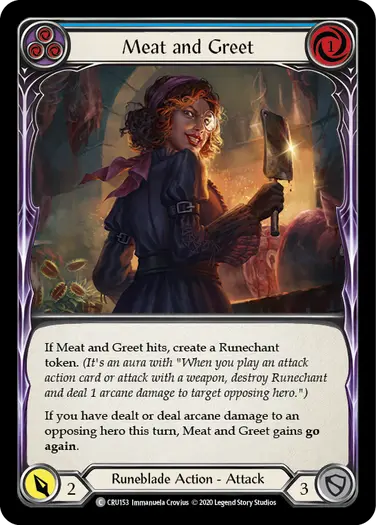 If Meat and Greet hits, create a Runechant token. (It's an aura with "When you play an attack action card or attack with a weapon, destroy Runechant and deal 1 arcane damage to target opposing hero.")