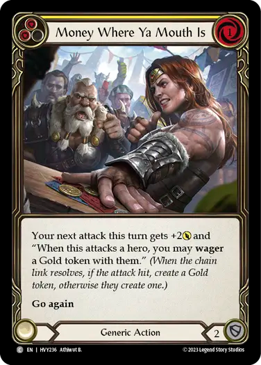 Your next attack this turn gets +2POWER and "When this attacks a hero, you may wager a Gold token with them." (When the chain link resolves, if the attack hit, you create a Gold token, otherwise they create one.)