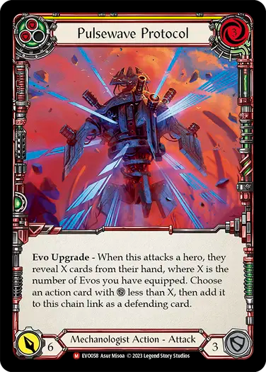 Evo Upgrade - When this attacks a hero, they reveal X cards from their hand, where X is the number of Evos you have equipped. Choose an action card with DEFENSE less than X, then add it to this chain link as a defending card.