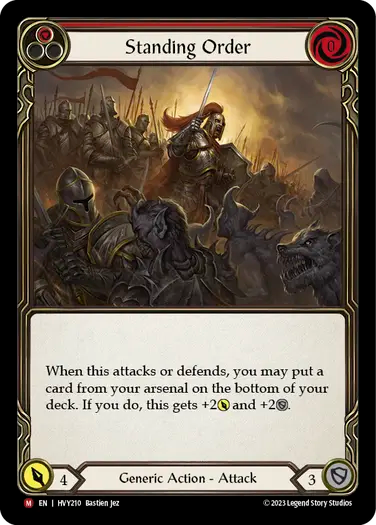 When this attacks or defends, you may put a card from your arsenal on the bottom of your deck. If you do, this gets +2POWER and +2DEFENSE.